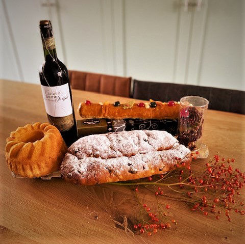 - Weihnachtsstol 450 gram - Roomboter Cake tulband - Roomboter Amandelkerststaaf in luxe koker - Fles wijn