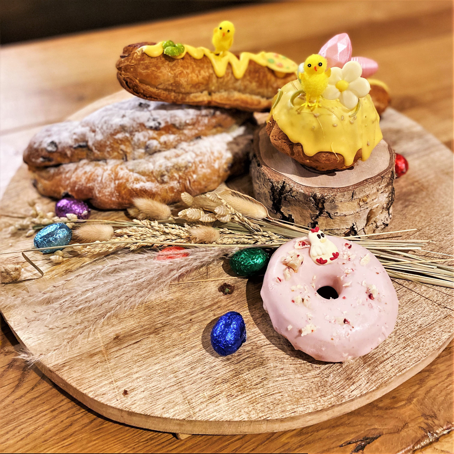 Inhoud: Heerlijke klein Lentebroedertje Luxe stollendeeg gevuld met romige amandelspijs met banketbakkers room en een vleugje kaneel Tulband in koker 2 personen Grote donut, 2 kleine donuts, 2 cakeijsjes, eitjes